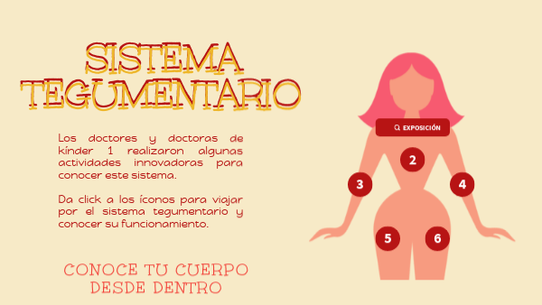 Los doctores y doctoras de kínder 1 realizaron algunas actividades innovadoras para conocer este sistema. Da click a los íconos para viajar por el sistema tegumentario y conocer su funcionamiento.