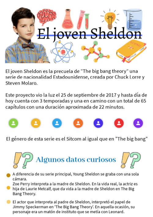 El joven Sheldon es la precuela de “The big bang theory” una serie de nacionalidad Estadounidense, creada por Chuck Lorre y Steven Molaro. Este proyecto vio la luz el 25 de septiembre de 2017 y hasta día de hoy cuenta con 3 temporadas y una en camino con un total de 65 capítulos con una duración aproximada de 22 minutos.