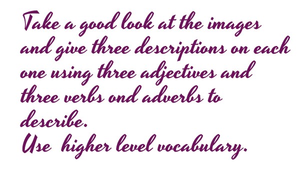 Take a good look at the images and give three descriptions on each one using three adjectives and three verbs ond adverbs to describe. Use higher level vocabulary.
