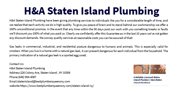 H&A Staten Island Plumbing have been giving plumbing services to individuals like you for a considerable length of time, and we realize that each activity we do is high quality. To give you peace of brain and to stand behind our workmanship we offer a 100% unconditional promise. In the event that any time within the 90 days post our work with you something breaks or faults we'll discount you 100% of what you paid us. Clearly we confidently offer this Guarantee as in the last 10 years we've not gotten any discount demands. We convey quality services at reasonable costs you can be assured of that! Gas leaks in commercial, industrial, and residential posture dangerous to humans and animals. This is especially valid for smokers. When you live in a home with a natural gas leak, it can present dangerous for each individual from the household. The primary indication of a natural gas leak is a spoiled egg smell. Contact Us: H&A Staten Island Plumbing Address:226 Colony Ave, Staten Island , NY 10306 Phone:(646) 904-4087 Email:statenisland@bestplumberqueensny.com website:https://www.bestplumberqueensny.com/staten-island-ny/