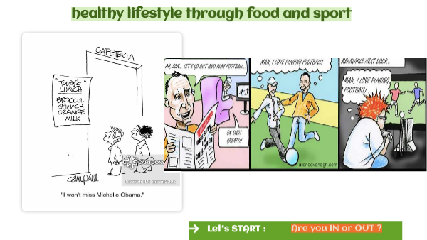 You work for the movement « Let’s Move » of Michelle Obama. You participate in an international debate for the Healthy eating vs Junk food. You are in or out.