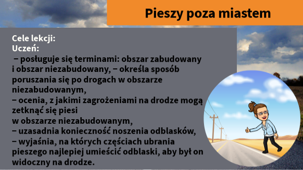 Cele lekcji: Uczeń: − posługuje się terminami: obszar zabudowany i obszar niezabudowany, − określa sposób poruszania się po drogach w obszarze niezabudowanym, − ocenia, z jakimi zagrożeniami na drodze mogą zetknąć się piesi w obszarze niezabudowanym, − uzasadnia konieczność noszenia odblasków, − wyjaśnia, na których częściach ubrania pieszego najlepiej umieścić odblaski, aby był on widoczny na drodze.