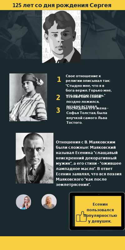 Отношения с В. Маяковским были сложные: Маяковский называл Есенина "слащавый неискренний декоративный мужик", а его стихи - "ожившее лампадное масло". В ответ Есенин заявлял, что вся поэзия Маяковского "как после землетрясения".