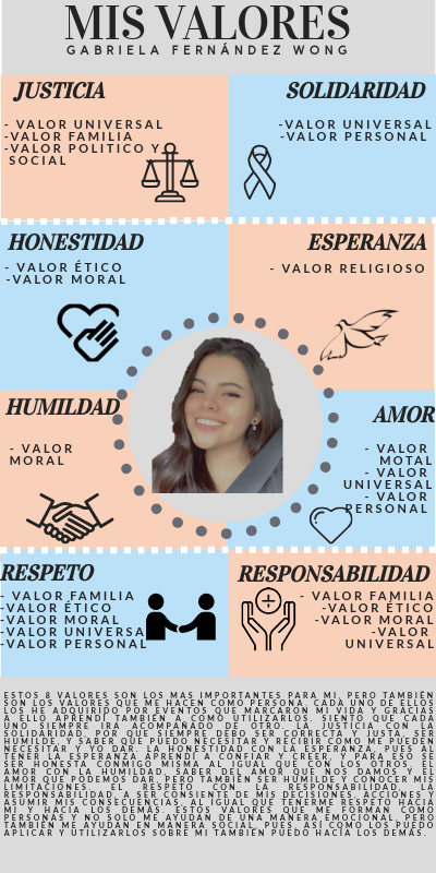 Estos 8 valores son los mas importantes para mi, pero también son los valores que me hacen como persona. Cada uno de ellos los he adquirido por eventos que marcaron mi vida y gracias a ello aprendí también a como utilizarlos. Siento que cada uno siempre ira acompañado de otro. La justicia con la solidaridad, por que siempre debo ser correcta y justa, ser humilde, y saber que puedo necesitar y recibir como me pueden necesitar y yo dar. La honestidad con la esperanza, pues al tener la esperanza aprendí a confiar y creer, y para eso se ser honesta conmigo misma al igual que con los otros. El amor con la humildad, saber del amor que nos damos y el amor que podemos dar, pero también ser humilde y conocer mis limitaciones. El respeto con la responsabilidad, la responsabilidad, a ser consiente de mis decisiones, acciones y asumir mis consecuencias, al igual que tenerme respeto hacia mi y hacia los demás. Estos valores que me forman como personas y no solo me ayudan de una manera emocional, pero también me ayudan en manera social, pues, así como los puedo aplicar y utilizarlos sobre mi también puedo hacía los demás.
