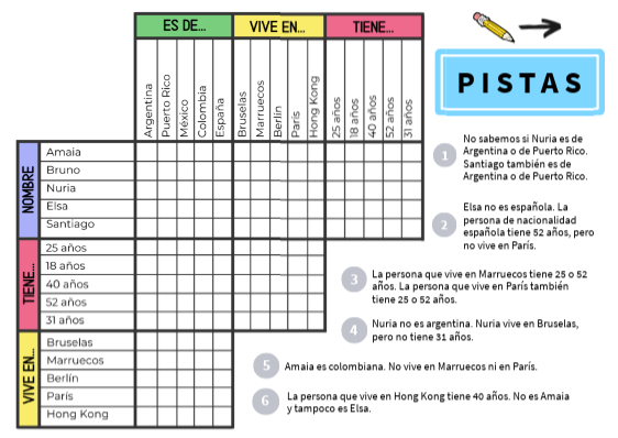 Amaia es colombiana, vive en Berlín y tiene 31 años.Bruno es español, vive en Marruecos y tiene 52 años. Nuria es puertorricense, vive en Bruselas y tiene 18 años. Elsa es mexicana, vive en París y tiene 25 años. Santiago es argentino, vive en Hong Kong y tiene 40 años.