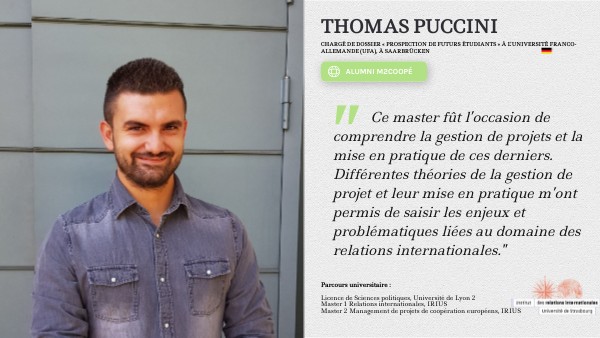 Pourquoi l'ITIRI ? Initialement, j’ai intégré l’ITIRI pour l’ouverture internationale qui y est proposée. Je me suis dit que ce serait le moyen de pouvoir développer mon apprentissage des langues étrangères afin de pouvoir les utiliser par la suite dans un contexte professionnel. Cela fait plusieurs années que je m’intéresse aux enjeux internationaux, européens et franco-allemands. Le master 2 coop était pour moi le moyen de me rapprocher de ces milieux et de ses acteurs afin de pouvoir un jour en faire partie.