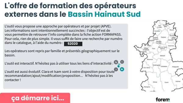 L'outil vous propose une approche par opérateurs et par projet (APVE). Les informations sont intentionnellement succinctes : l'objectif est de vous permettre de retrouver l'info complète dans la fiche action FORMAPASS. Pour cela, rien de plus simple. Il vous suffit de faire une recherche par numéro dans le catalogue, à l'aide du numéro : Les opérateurs sont repris par famille et présentés géographiquement sur le bassin. L'outil est interactif. N'hésitez pas à utiliser tous les liens d'interactivité : L'outil est aussi évolutif. Clara et Isam sont à votre disposition pour toute recommandation/ajout/modification/proposition... N'hésitez pas à les contacter !