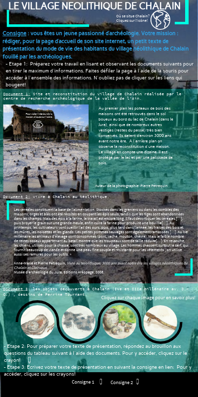 Consigne : vous êtes un jeune passionné d’archéologie. Votre mission : rédiger, pour la page d’accueil de son site internet, un petit texte de présentation du mode de vie des habitants du village néolithique de Chalain fouillé par les archéologues.