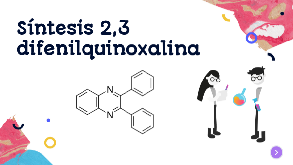 [1]Universidad de Chile (n.d) Quimica organica III.Recuperado de: https://www.ucursos.cl/usuario/2775c7595e300ed228a801eb8341e457/mi_blog/r/Lab_QOII_2012_OTONO.pdf[2]Labmonk (2017) Synthesis of 2,3- diphenylquinoxaline reaction. Retrieved from: https://labmonk.com/synthesis-of-23-diphenylquinoxaline [3]National Institute of Standards and technology(2018)Quinoxaline, 2,3-diphenyl. Retrieved form:https://webbook.nist.gov/cgi/inchi?ID=C1684146&Mask=8 [4] Furniss, B., Hannaford, A,. Smith, P. & Tatchell, A. (1989) Vogel’s Textbook of practical Organic Chemistry. Fifth Edition. Pag. 1190&1045 [5] Mondragón, P. ESPECTROSCOPIA DE INFRARROJO PARA TODOS. recuperado de:https://ciatej.mx/files/divulgacion/divulgacion_5a43b7c09fdc1.pdf [6] Vogel A.I., “A Textbook of Practical Organic Chemists”, 3a Ed., Longsmans Green and Co., London, 1956, 708 – 709 y 714 - 715 [7] Islami, M., Hassani, Z. (2008). One-pot and efficient protocol for synthesis of quinoxaline derivatives. Department of Chemistry, Shahid Bahonar University, Kerman, Iran.