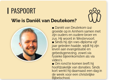 ▪ Daniël van Deutekom (24) groeide op in Arnhem samen met zijn ouders en oudere broer en zus. Hij woont in Westervoort. ▪ Sinds hij zijn vwo-diploma vijf jaar geleden haalde, wijdt hij zijn leven aan evangelisatie en gebedsgenezing, zowel via fysieke bijeenkomsten als via video's. ▪ Om rond te komen leeft hij hoofdzakelijk van donaties. Sinds kort werkt hij daarnaast een dag in de week voor een christelijke Bijbelschool.