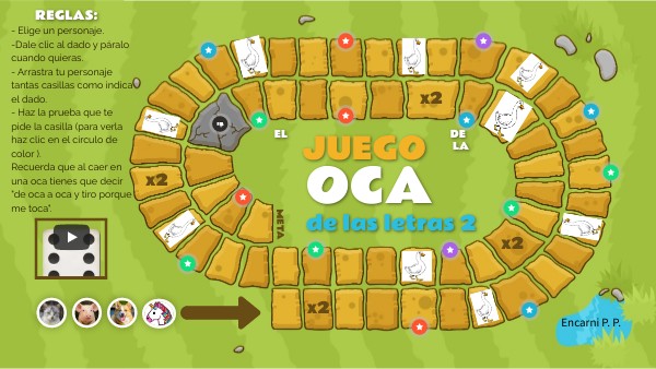 - Elige un personaje.-Dale clic al dado y páralo cuando quieras. - Arrastra tu personaje tantas casillas como indica el dado. - Haz la prueba que te pide la casilla (para verla haz clic en el circulo de color ). Recuerda que al caer en una oca tienes que decir "de oca a oca y tiro porque me toca".