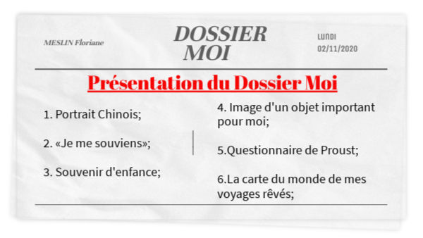4. Image d'un objet important pour moi; 5.Questionnaire de Proust; 6.La carte du monde de mes voyages rêvés;