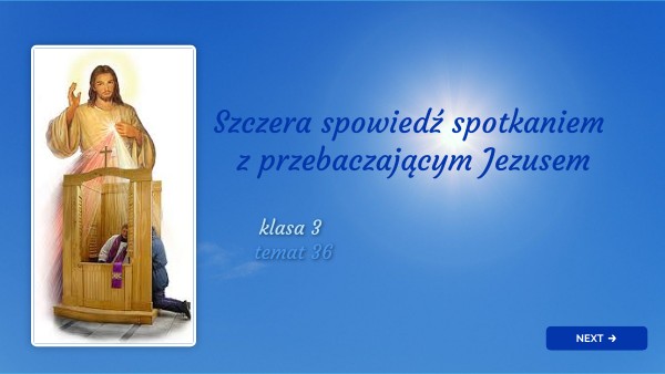 P. Niech będzie pochwalony Jezus Chrystus. Ksiądz odpowiada: - Na wieki wieków. Amen. P. W imię Ojca i Syna i Ducha Świętego. Amen. /przeżegnaj się/ P. Mam … lat. Jestem uczniem/uczennicą klasy III. Do sakramentu pokuty przystępuję pierwszy raz. Zgrzeszyłam przeciwko Bogu następującymi grzechami: Wymień spokojnie grzechy. Po wyznaniu swoich win powiedz: P. Więcej grzechów nie pamiętam, za wszystkie serdecznie żałuję i postanawiam poprawę. Proszę cię Ojcze o pokutę i rozgrzeszenie. Kapłan udzieli ci pouczenia i powie, jaką pokutę masz czynić. Postaraj się ją zapamiętać. Potem ksiądz zachęci cię do żalu: Żałuj za grzechy. Wzbudź w sobie jeszcze raz żal za wszystkie swoje grzechy i módl się. P. Boże, bądź miłościw mnie, grzesznemu/grzesznej! (3 razy) Kapłan udzieli ci w tym czasie rozgrzeszenia kończac słowami: I ja odpuszczam Tobie grzechy w imię Ojca i Syna i Ducha Świętego. P. Amen. Ks. Wysławiajmy Pana, bo jest dobry. P. Bo Jego miłosierdzie trwa na wieki. Ks. Pan odpuścił Tobie grzechy. Idź w pokoju. P. Bóg zapłać.