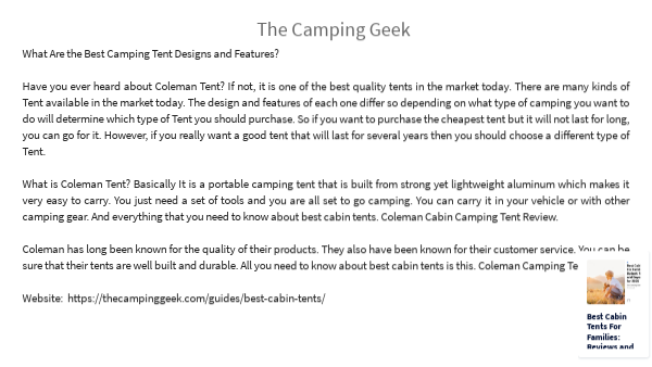 What Are the Best Camping Tent Designs and Features?Have you ever heard about Coleman Tent? If not, it is one of the best quality tents in the market today. There are many kinds of Tent available in the market today. The design and features of each one differ so depending on what type of camping you want to do will determine which type of Tent you should purchase. So if you want to purchase the cheapest tent but it will not last for long, you can go for it. However, if you really want a good tent that will last for several years then you should choose a different type of Tent.What is Coleman Tent? Basically It is a portable camping tent that is built from strong yet lightweight aluminum which makes it very easy to carry. You just need a set of tools and you are all set to go camping. You can carry it in your vehicle or with other camping gear. And everything that you need to know about best cabin tents. Coleman Cabin Camping Tent Review.Coleman has long been known for the quality of their products. They also have been known for their customer service. You can be sure that their tents are well built and durable. All you need to know about best cabin tents is this. Coleman Camping Tent Review. Website: https://thecampinggeek.com/guides/best-cabin-tents/