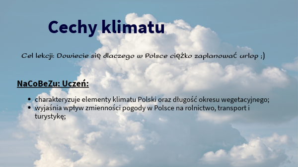 - charakteryzuje elementy klimatu Polski oraz długość okresu wegetacyjnego;