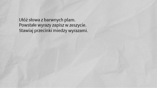 Ułóż słowa z barwnych plam. Powstałe wyrazy zapisz w zeszycie. Stawiaj przecinki miedzy wyrazami.
