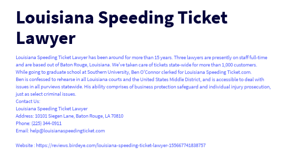 Louisiana Speeding Ticket Lawyer has been around for more than 15 years. Three lawyers are presently on staff full-time and are based out of Baton Rouge, Louisiana. We've taken care of tickets state-wide for more than 1,000 customers. While going to graduate school at Southern University, Ben O'Connor clerked for Louisiana Speeding Ticket.com. Ben is confessed to rehearse in all Louisiana courts and the United States Middle District, and is accessible to deal with issues in all purviews statewide. His ability comprises of business protection safeguard and individual injury prosecution, just as select criminal issues. Contact Us: Louisiana Speeding Ticket Lawyer Address: 10101 Siegen Lane, Baton Rouge, LA 70810 Phone: (225) 344-0911 Email: help@louisianaspeedingticket.com Website : https://reviews.birdeye.com/louisiana-speeding-ticket-lawyer-155667741838757
