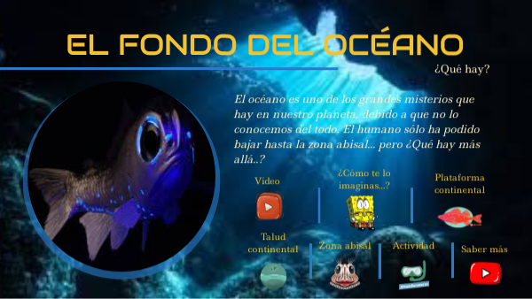 Se explican las partes del océano (zona abisal plataforma continental y talud), y un quiz para reforzar el conocimiento