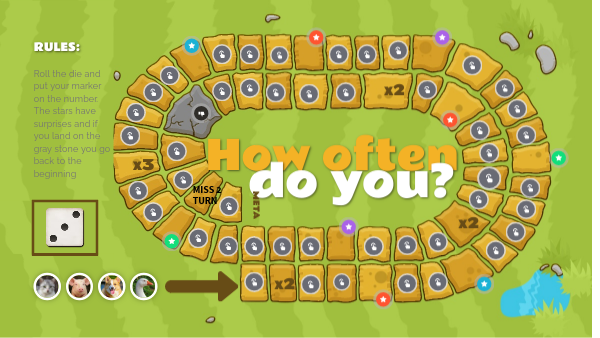 Roll the die and put your marker on the number. The stars have surprises and if you land on the gray stone you go back to the beginning