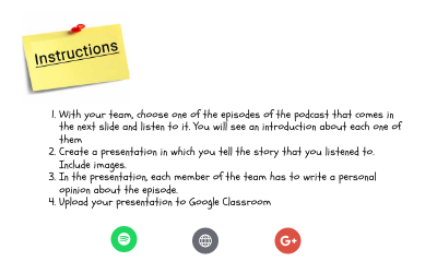- In teams of 4 people as maximum, choose one of the episodes of the podcast that comes in the next slide and listen to it, or if you prefer, you can watch it on Amazon Prime Video as well. (You will see a brief description about each one of them, so you can make a decision).