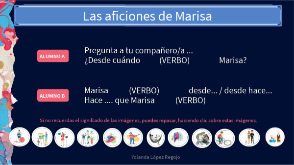 Pregunta a tu compañero/a ...¿Desde cuándo (VERBO) Marisa? Marisa (VERBO) desde... / desde hace... Hace .... que Marisa (VERBO)