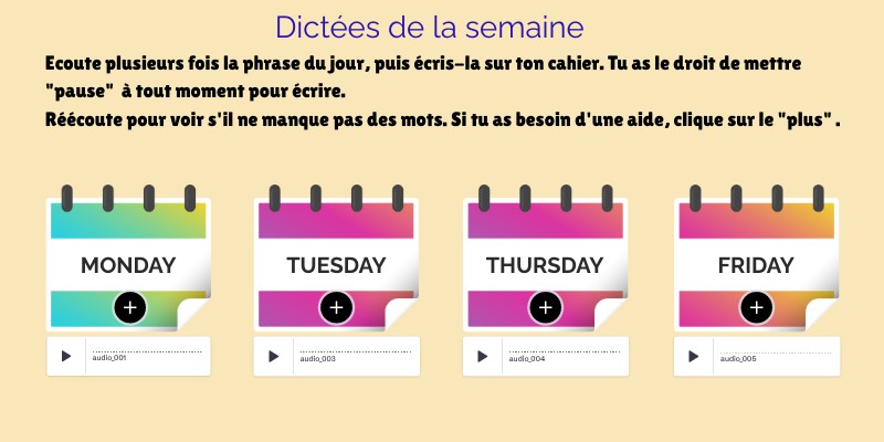 Ecoute plusieurs fois la phrase du jour, puis écris-la sur ton cahier. Tu as le droit de mettre "pause" à tout moment pour écrire. Réécoute pour voir s'il ne manque pas des mots. Si tu as besoin d'une aide, clique sur le "plus" .
