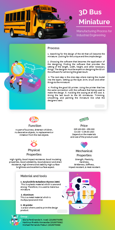 1. Acrylonitrile Butadiene Styrene (ABS) This is a plastic material which is save and strong. Therefore, it is used to make bus miniature. 2. Aluminum This is a metal material which is multipurpose and mild. 3. 3D printer is a tool where used to print the design product.