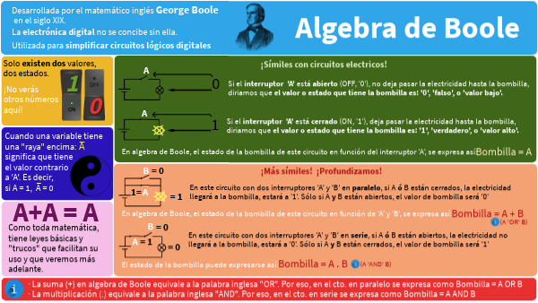 · La suma (+) en algebra de Boole equivale a la palabra inglesa "OR". Por eso, en el cto. en paralelo se expresa como Bombilla = A OR B