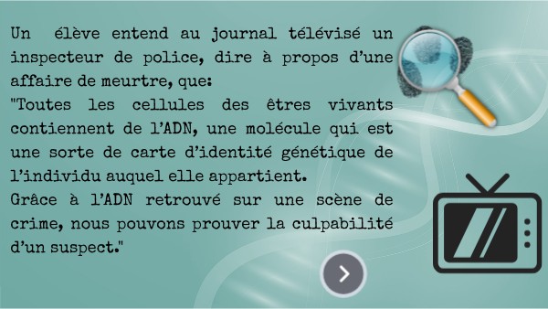 Un élève entend au journal télévisé un inspecteur de police, dire à propos d’une affaire de meurtre, que: "Toutes les cellules des êtres vivants contiennent de l’ADN, une molécule qui est une sorte de carte d’identité génétique de l’individu auquel elle appartient.Grâce à l’ADN retrouvé sur une scène de crime, nous pouvons prouver la culpabilité d’un suspect."