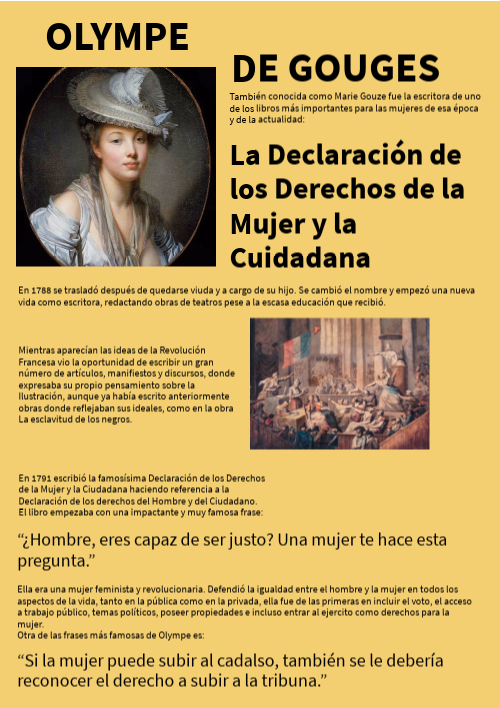 En 1791 escribió la famosísima Declaración de los Derechos de la Mujer y la Ciudadana haciendo referencia a la Declaración de los derechos del Hombre y del Ciudadano. El libro empezaba con una impactante y muy famosa frase: