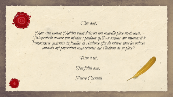Cher ami,Mon vieil ennemi Molière vient d'écrire une nouvelle pièce mystrieuse. J'aimerais te donner une mission : pendant qu'il va amener son manuscrit à l'imprimerie, pourrais-tu fouiller sa résidence afin de relever tous les indices présents qui pourraient nous orienter sur l'histoire de sa pièce? Bien à toi, Ton fidèle ami, Pierre Corneille