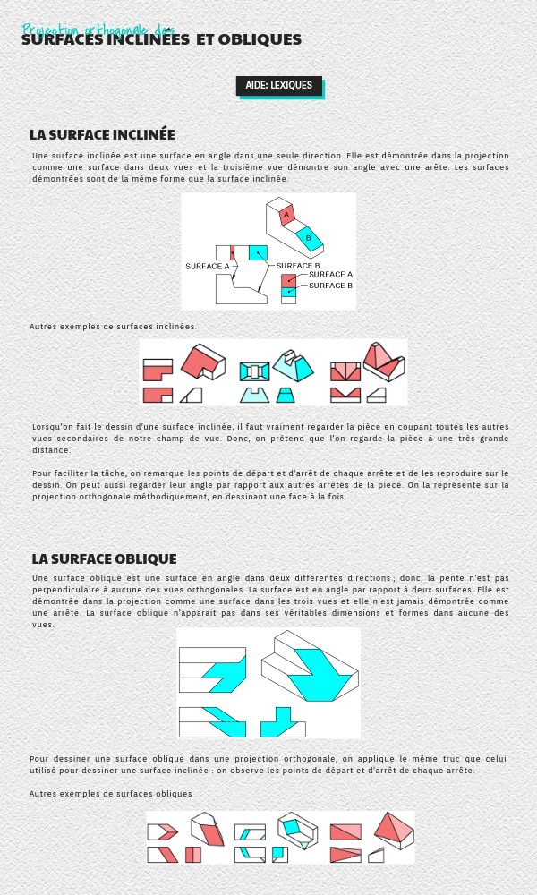 Lorsqu’on fait le dessin d’une surface inclinée, il faut vraiment regarder la pièce en coupant toutes les autres vues secondaires de notre champ de vue. Donc, on prétend que l’on regarde la pièce à une très grande distance. Pour faciliter la tâche, on remarque les points de départ et d’arrêt de chaque arrête et de les reproduire sur le dessin. On peut aussi regarder leur angle par rapport aux autres arrêtes de la pièce. On la représente sur la projection orthogonale méthodiquement, en dessinant une face à la fois.