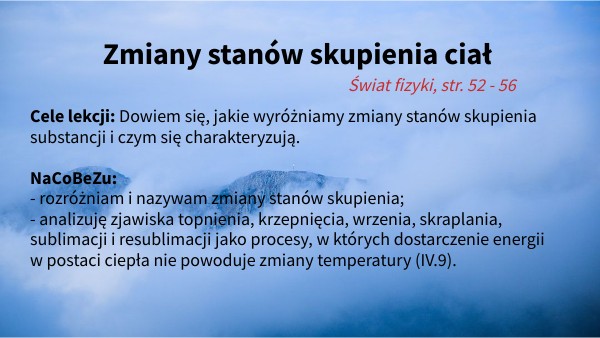 Cele lekcji: Dowiem się, jakie wyróżniamy zmiany stanów skupienia substancji i czym się charakteryzują. NaCoBeZu: - rozróżniam i nazywam zmiany stanów skupienia; - analizuję zjawiska topnienia, krzepnięcia, wrzenia, skraplania, sublimacji i resublimacji jako procesy, w których dostarczenie energii w postaci ciepła nie powoduje zmiany temperatury (IV.9).