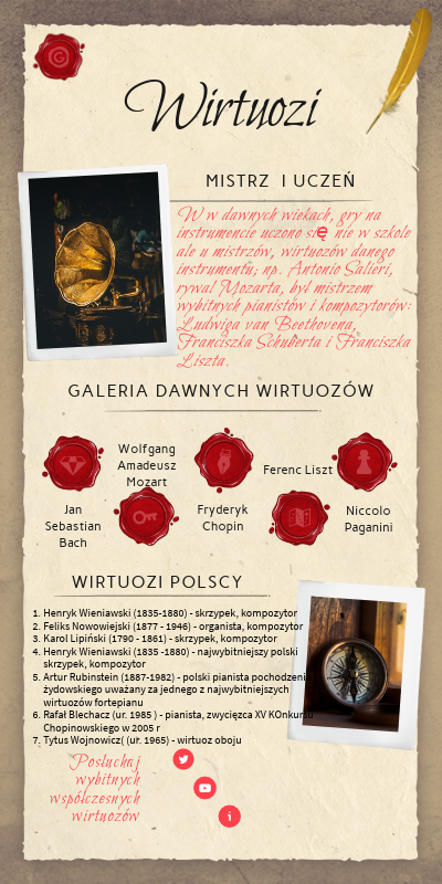 W w dawnych wiekach, gry na instrumencie uczono się nie w szkole ale u mistrzów, wirtuozów danego instrumentu; np. Antonio Salieri, rywal Mozarta, był mistrzem wybitnych pianistów i kompozytorów: Ludwiga van Beethovena, Franciszka Schuberta i Franciszka Liszta.