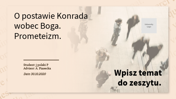 WPISZ DO ZESZYTU - patriota, kocha swoj naród, rozumie, w jak rozpaczliwej sytuacji znajdują się wszyscy Polacy; - zależy mu na narodzie, chce być jego przewodnikiem; - w rozmowie z Bogiem chce poznać sposób na uszczęślwienie narodu, na jego podniesienie; - gdyby dostał władzę- mógłby na nowo wstorzyć historię własnego narodu- tym razem szczęśliwą; - oczekuje bezwzględnego posłuszeństwa od narodu, w przeciwnym razie- pozwoli mu zginać