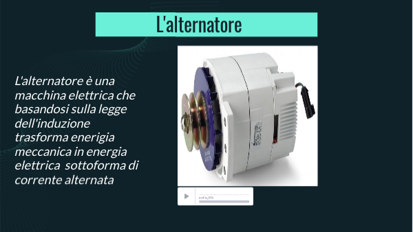 L'alternatore è una macchina elettrica che basandosi sulla legge dell'induzione trasforma enerigia meccanica in energia elettrica sottoforma di corrente alternata