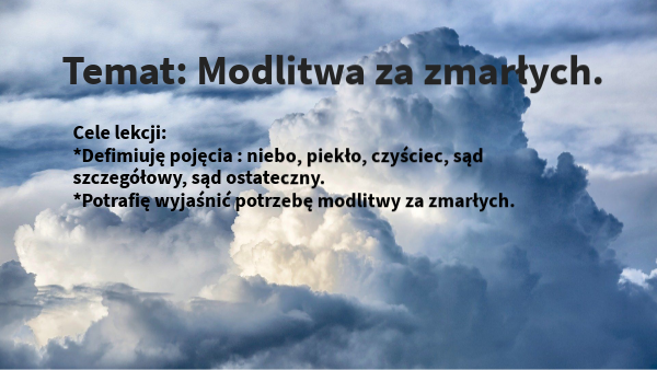 Cele lekcji: *Defimiuję pojęcia : niebo, piekło, czyściec, sąd szczegółowy, sąd ostateczny. *Potrafię wyjaśnić potrzebę modlitwy za zmarłych.