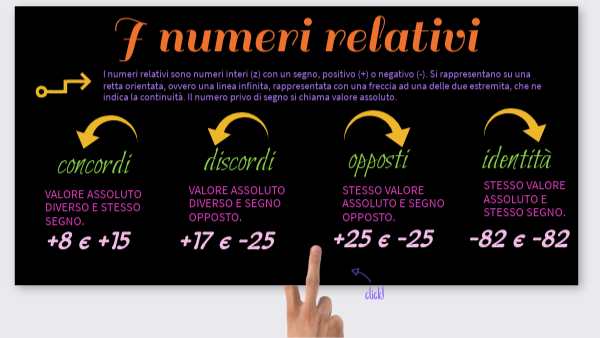 I numeri relativi sono numeri interi (z) con un segno, positivo (+) o negativo (-). Si rappresentano su una retta orientata, ovvero una linea infinita, rappresentata con una freccia ad una delle due estremita, che ne indica la continuità. Il numero privo di segno si chiama valore assoluto.