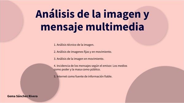 1. Análisis técnico de la imagen. 2. Análisis de imagenes fijas y en movimiento. 3. Análisis de la imagen en movimiento. 4. Incidencia de los mensajes según el emisor. Los medios como poder y la masa como público. 5. Internet como fuente de información fiable.
