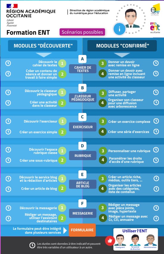 Votre scénario : Construisez votre scénario pour concrétiser un projet ou un besoin d'utiliser l'ENT comme support. Naviguez dans les modules et demandez de l'aide aux formateurs.