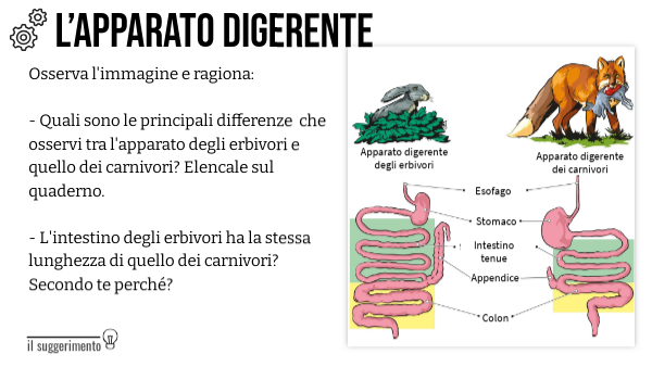 Osserva l'immagine e ragiona: - Quali sono le principali differenze che osservi tra l'apparato degli erbivori e quello dei carnivori? Elencale sul quaderno. - L'intestino degli erbivori ha la stessa lunghezza di quello dei carnivori? Secondo te perché?