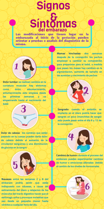 Nauseas: entre las semanas 2 y 8 del embarazo podría sentir que estás indispuesto con náuseas, a causa del estiramiento del útero y relajacion de los músculos del tracto digestivo hacen que el estómago sufra y provoque molestias que van desde un pequeño mareo hasta vómitos a cualquier hora del día.