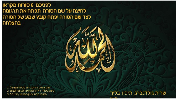 לפניכם 6 סורות מקראן לחיצה על שם הסורה תפתח את תרגומה לצד שם הסורה יפתח קובץ שמע של הסורה בהצלחה