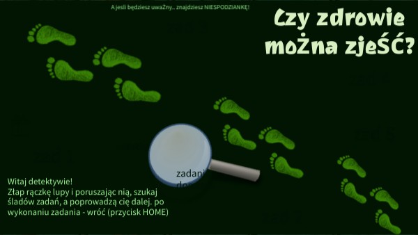 Witaj detektywie! Złap rączkę lupy i poruszając nią, szukaj śladów zadań, a poprowadzą cię dalej. po wykonaniu zadania - wróć (przycisk HOME)