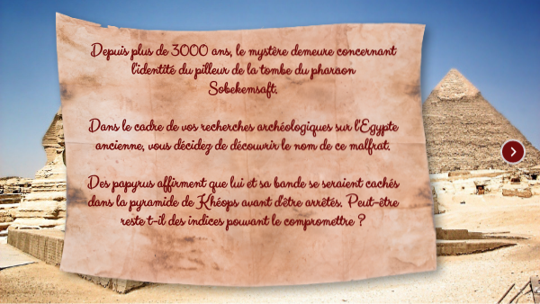 Depuis plus de 3000 ans, le mystère demeure concernant l'identité du pilleur de la tombe du pharaon Sobekemsaft. Dans le cadre de vos recherches archéologiques sur l'Egypte ancienne, vous décidez de découvrir le nom de ce malfrat. Des papyrus affirment que lui et sa bande se seraient cachés dans la pyramide de Khéops avant d'être arrêtés. Peut-être reste t-il des indices pouvant le compromettre ?