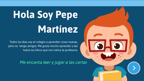 Todos los días voy al colegio a aprender cosas nuevas, pero no tengo amigos. Me gusta mucho aprender y leo todos los libros que nos indica la profesora.