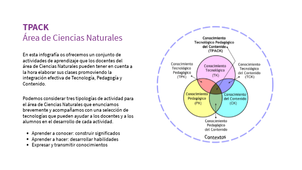 En esta infografía os ofrecemos un conjunto de actividades de aprendizaje que los docentes del área de Ciencias Naturales pueden tener en cuenta a la hora elaborar sus clases promoviendo la integración efectiva de Tecnología, Pedagogía y Contenido.