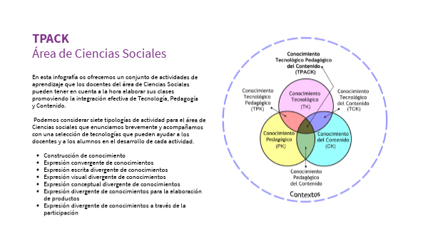 En esta infografía os ofrecemos un conjunto de actividades de aprendizaje que los docentes del área de Ciencias Sociales pueden tener en cuenta a la hora elaborar sus clases promoviendo la integración efectiva de Tecnología, Pedagogía y Contenido.