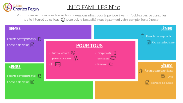 Vous trouverez ci-dessous toutes les informations utiles pour la période à venir, n'oubliez pas de consulter le site internet du collège pour suivre l'actualité mais également votre compte EcoleDirecte!