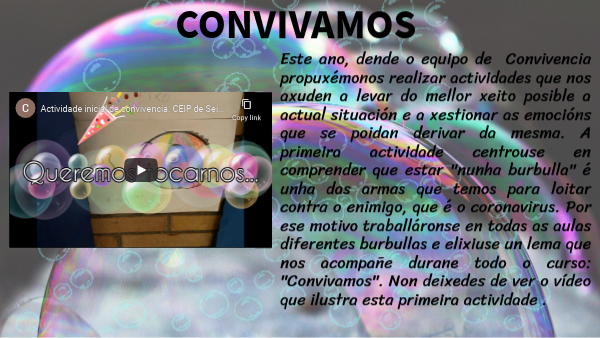 Este ano, dende o equipo de Convivencia propuxémonos realizar actividades que nos axuden a levar do mellor xeito posible a actual situación e a xestionar as emocións que se poidan derivar da mesma. A primeira actividade centrouse en comprender que estar "nunha burbulla" é unha das armas que temos para loitar contra o enimigo, que é o coronavirus. Por ese motivo traballáronse en todas as aulas diferentes burbullas e elixiuse un lema que nos acompañe durane todo o curso: "Convivamos". Non deixedes de ver o vídeo que ilustra esta primeira actividade .